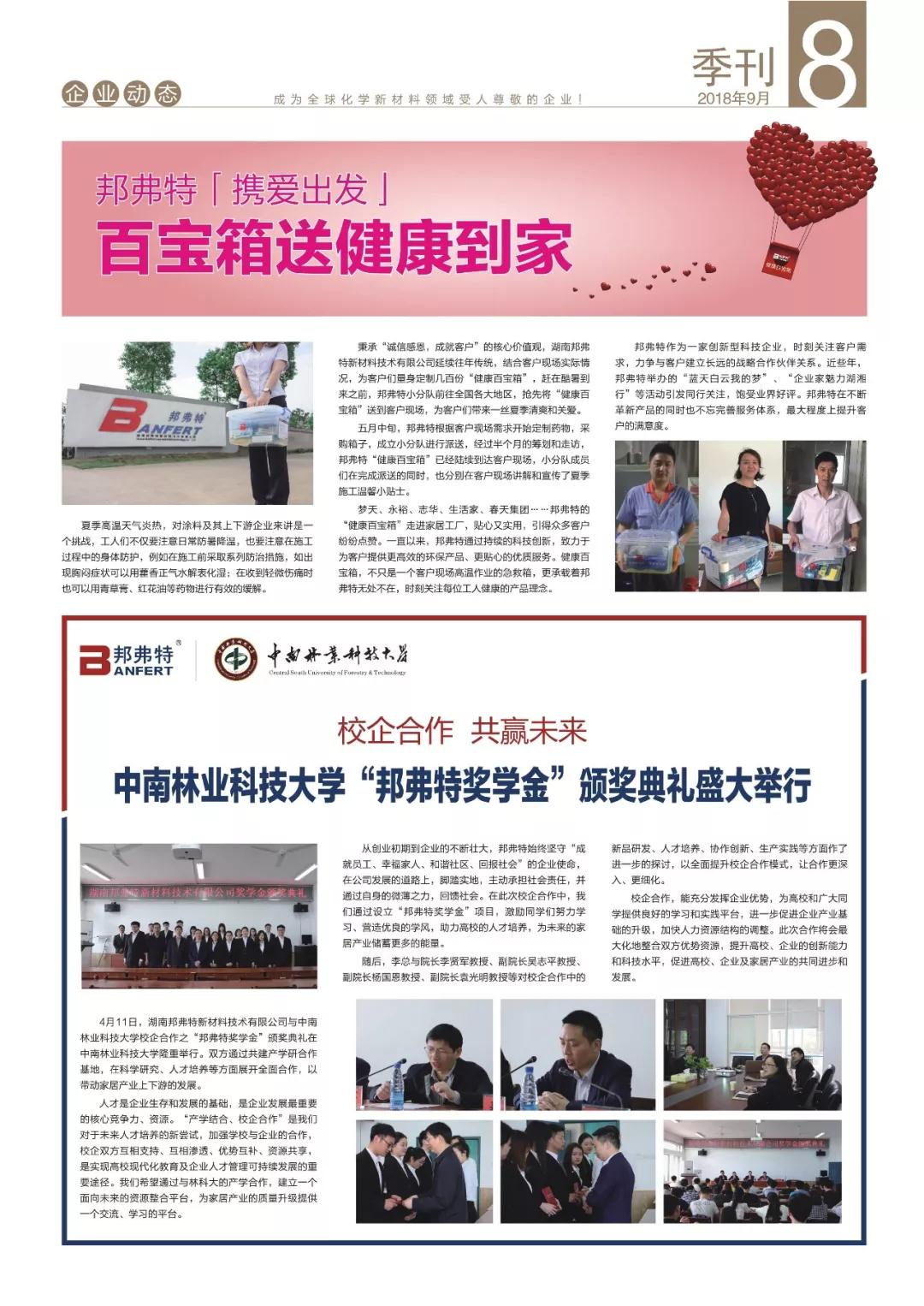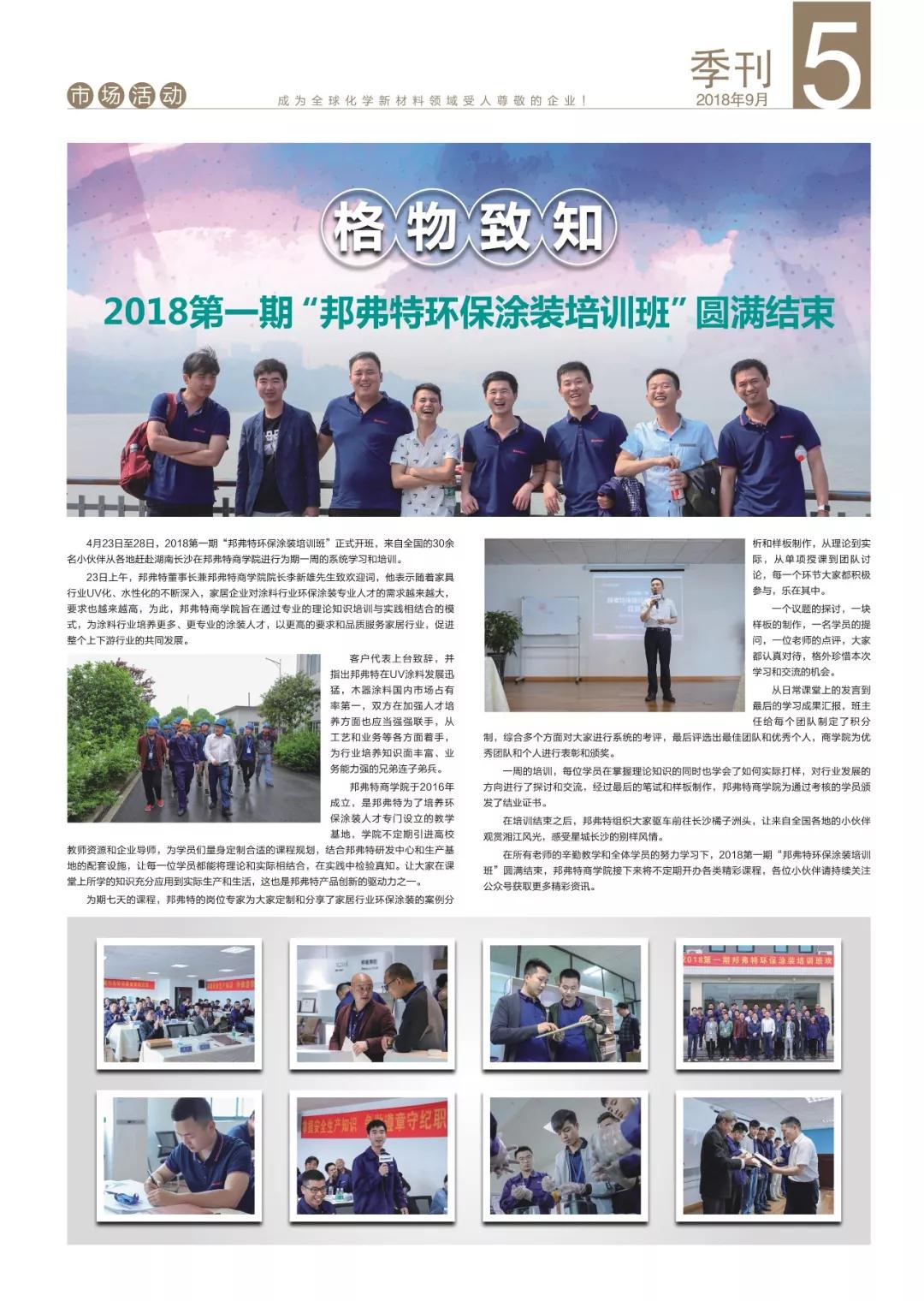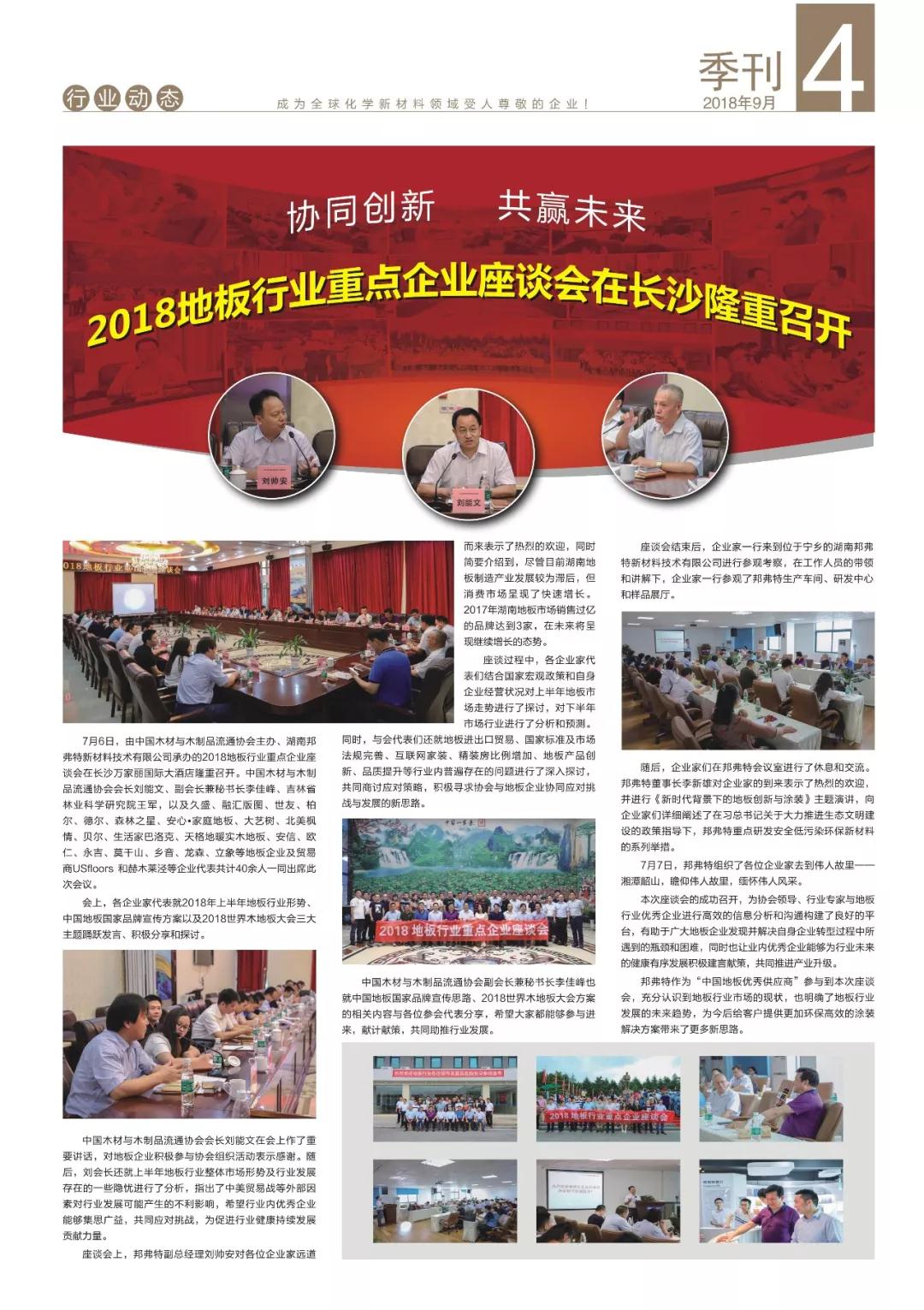 新品研發(fā)率先通過加州65號提案,年中培訓打造高效團隊,地板行業(yè)重點企業(yè)座談會與客戶協(xié)同創(chuàng)新,環(huán)保涂裝培訓班格物致知,邦弗特獎學金走進高等學府,健康百寶箱攜愛出發(fā)……