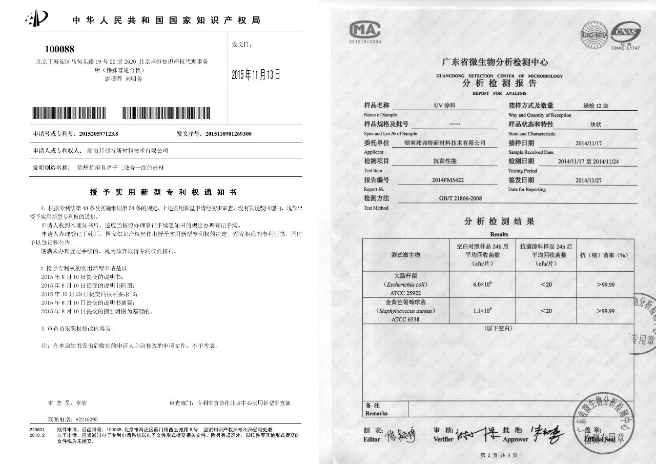 邦弗特UV抗菌涂料專利證書及檢測報告