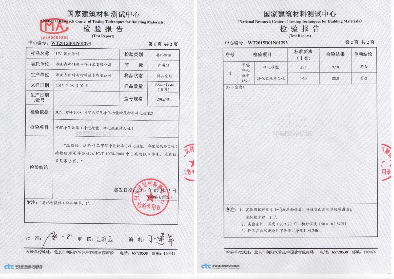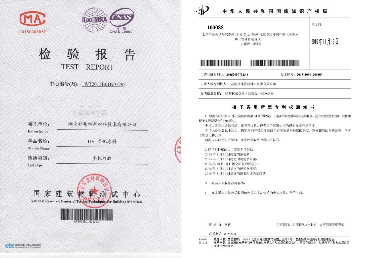 邦弗特UV除醛涂料檢測報告及專利證書