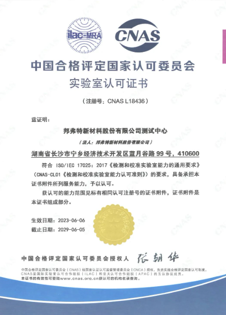 近日,邦弗特新材料股份有限公司測(cè)試中心順利通過中國(guó)合格評(píng)定國(guó)家認(rèn)可委員會(huì)(CNAS)認(rèn)可(注冊(cè)號(hào):CNAS L18436)。