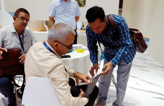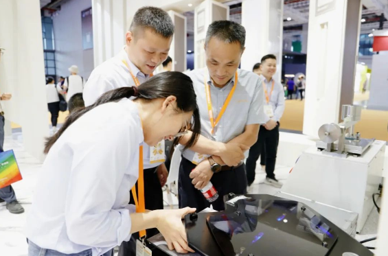 作為邦弗特獨立自主研發產品,業內不少人士前來展位現場觀摩與咨詢預涂PVC膜系列產品。而且,現場邦弗特專業測試人員用馬丁代爾耐磨儀等設備,對產品進行物理性能測試,以數據證明產品的先進品質。
