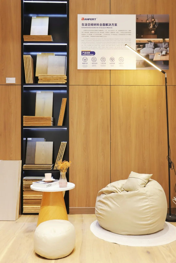 材料的演進,能逐漸改變產品,進而改變我們的生活。邦弗特在展位里打造的墻地一體化空間,采用自主研發的木地板涂裝方案、復合墻板等產品,以木質的紋理、純粹的顏色、富有藝術感的設計,打造出一個最自然最質樸的家居空間。