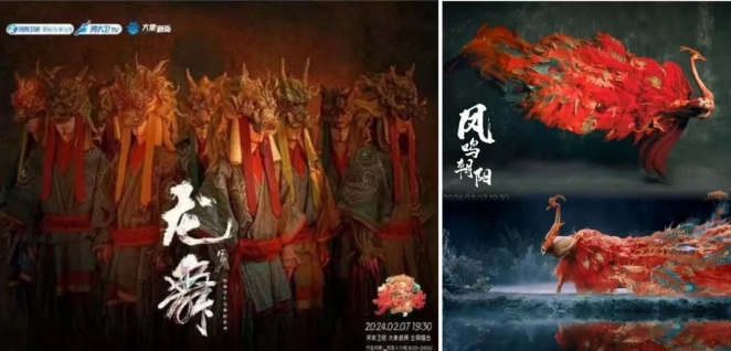各臺春晚均推出龍年大戲, 央視春晚除舞美以龍貫穿全場外,關于龍的節目有:開場《鼓舞龍騰》,戲曲《百花爭艷:龍鳳呈祥》、歌曲《龍》、舞蹈《錦鯉:魚躍龍門》、雜技《躍龍門》、相聲《龍年說龍》等。河南衛視春晚楊麗萍推出的《龍舞》《鳳鳴朝陽》龍鳳雙舞,氣勢恢宏,引人沉浸式感知文化的厚重及意義。