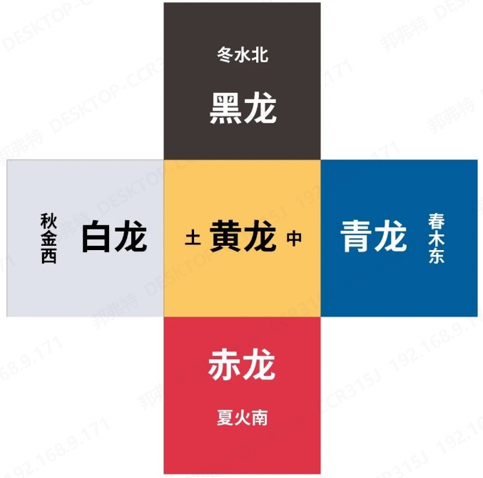 《史記·封禪書》記載道,"黃帝得土德,黃龍地殃見。夏得木德,青龍止于郊,草木暢茂。殷得金德,銀自山溢。周得火德,有赤鳥之符。今泰變周,水德之時。昔秦文公出獵,獲黑龍,此其水德之瑞。"青龍、赤龍、黃龍、白龍、黑龍守護東、南、中、西、北五方。