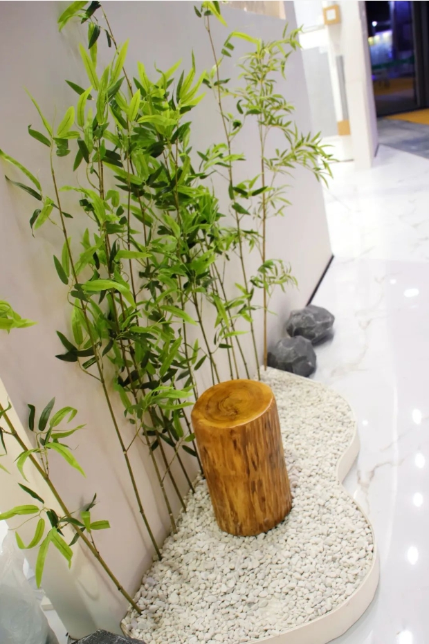 走進邦弗特展位,觀眾宛如走進一個沉浸式的自然材料空間。邦弗特此次展位設計靈感源自王羲之的《蘭亭集序》,四周竹木環繞,山石旁立,營造“茂林修竹”景觀,給人舒適自然之感。