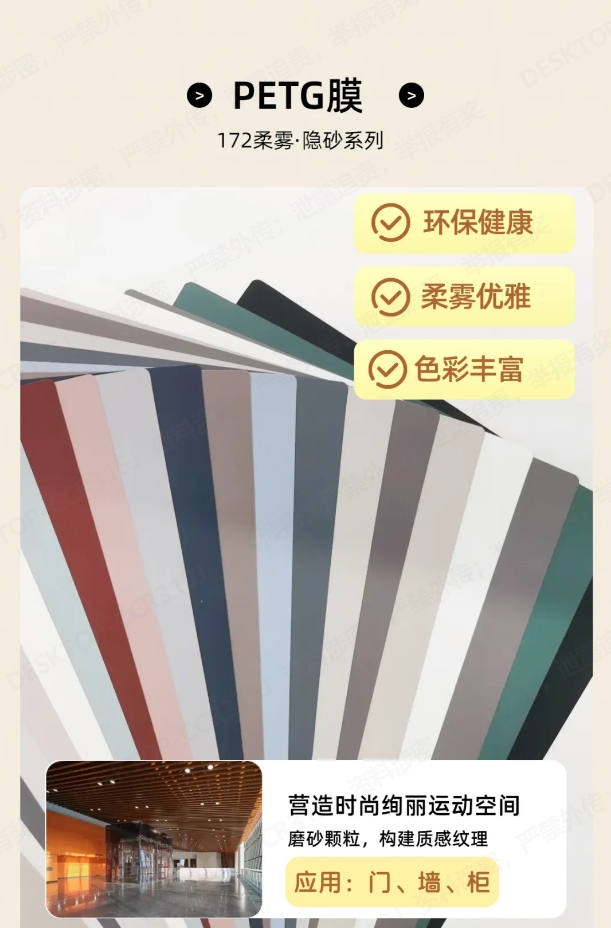 172柔霧隱砂系列PETG膜采用172納米光源固化技術,配以綠色環(huán)保高性能功能涂料,使生活空間產(chǎn)品色感、光感、觸感無限接近柔霧,豐富色彩營造時尚活力運動空間。