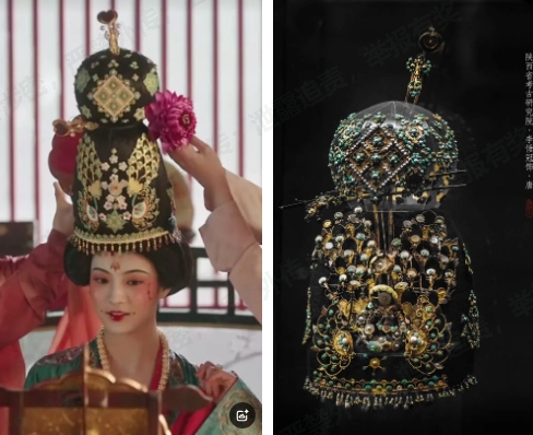 劇中處處暗藏文物,不少道具所參考的文物被眼尖的網(wǎng)友們“扒出”。其中,劇中縣主大婚所戴冠,其原型為唐高祖李淵玄孫女李倕所用發(fā)冠,精致奢華。劇組文物顧問李乾鑫(西安博物院的講解員)提到:觀眾沒有注意到的一些細(xì)節(jié)里,還隱藏了一些“小彩蛋”。