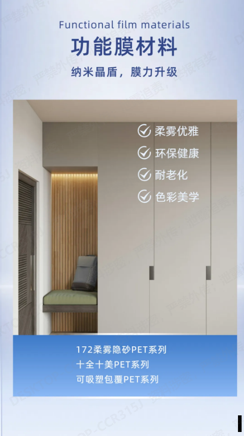 絲絨白、茶白、月光黃、卵石灰、胡桃暖咖、煙紅色……當這些源自自然的色彩,在172柔霧隱砂PET膜上鋪開,一個和諧、美好、可持續的生活環境也正在徐徐展開。