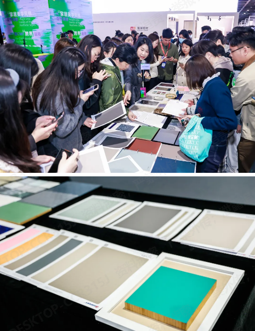 圍繞“色彩”和“紋理”兩大核心方向,邦弗特CMFP創意設計團隊結合飾面材料的材質和工藝,推出板材涂飾材料的色彩趨勢,打造中性、復古為主的整面色彩墻,吸引不少觀眾駐足觀看。