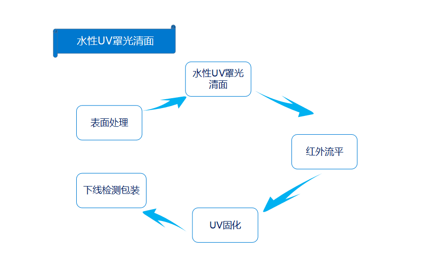 表面處理——水性UV罩光清面——紅外流平——UV固化——下線檢測包裝